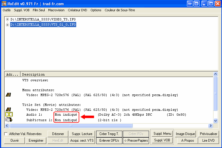 Nous devons maintenant faire quelques petites modifications. Cliquez sur VTS_01_0.IFO, et vous serez averti que les attributs audio et de sous-titrage n'ont pas de langue indiquée: