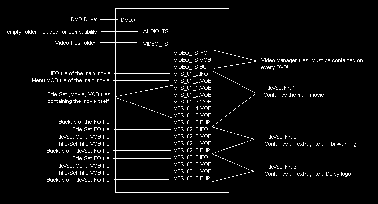 VIDEO_TS.* Représente le Manager Vidéo DVD. Il doit être présent dans chaque DVD. Il peut contenir un Menu et la plupart du temps il contient les avertissements fbi et les présentations du Dolby Digital. VTS_xx_x.* Représente un couple de titres. Un couple de titres peut contenir un film et un menu. Il peut aussi contenir uniquement un menu, ou uniquement un film.