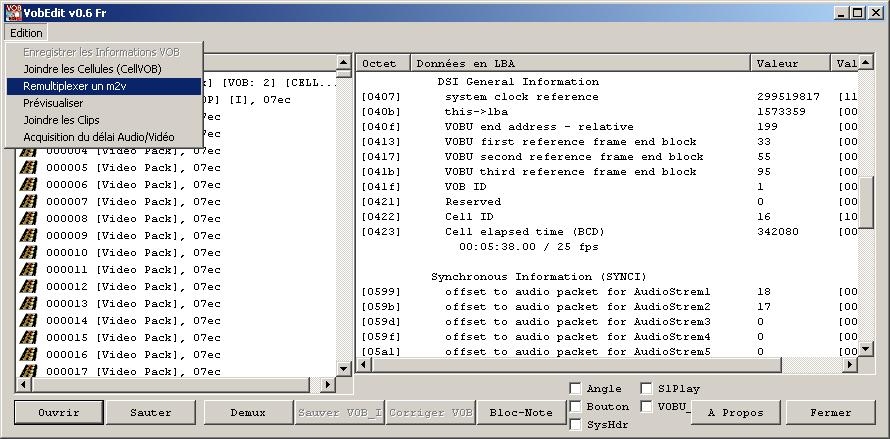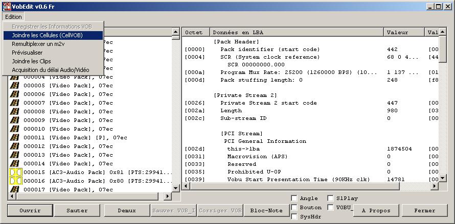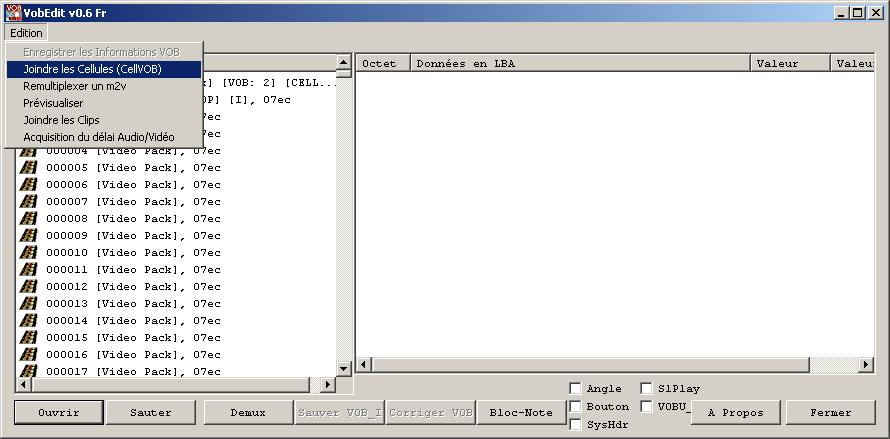Maintenant ouvrez VTS_01_005.VOB avec VobEdit et choisissez le menu: 'Edition -> Joindre les cellules (Cellvobs)':