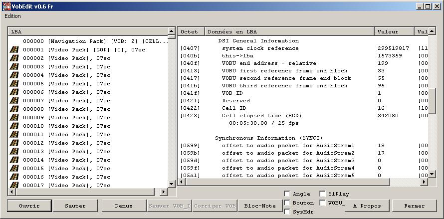 Premièrement je regarde VTS_01_4.VOB avec VobEdit pour voir quels IDs de cellule sont utilisés.