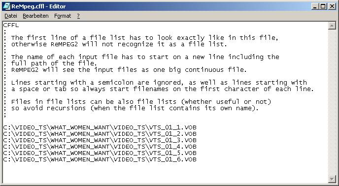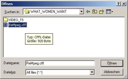 Par exemple, J'ai enregistré le fichier comme ceci: 'C:\VIDEO_TS\WHAT_WOMEN_WANT\ReMpeg.cffl'.