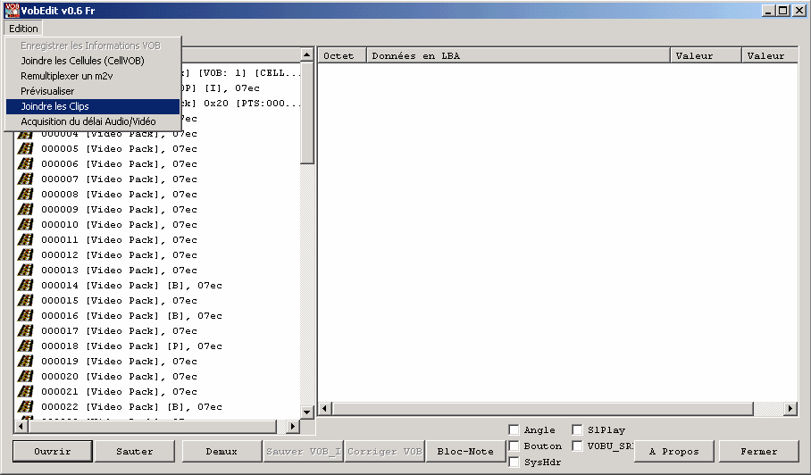 Il faut donc charger le fichier VTS_01_4.VOB de la face A dans VobEdit, et descendre jusqu'au dernier "Navigation Pack". La dernière ID-VOB, dans notre cas, est l'ID-VOB n°2